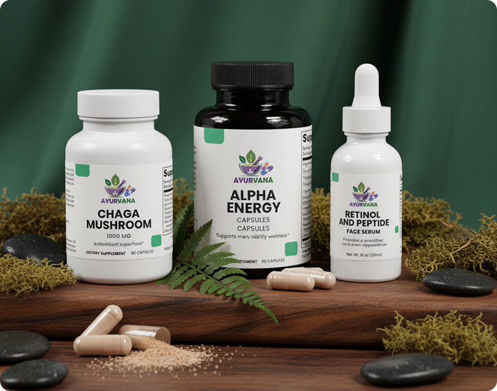 AYURVANA blends centuries-old Ayurvedic wisdom with modern nutritional science. Each formula is thoughtfully crafted using high-quality herbs, functional mushrooms, and bioavailable delivery systems to help your body absorb more and perform better — naturally.
